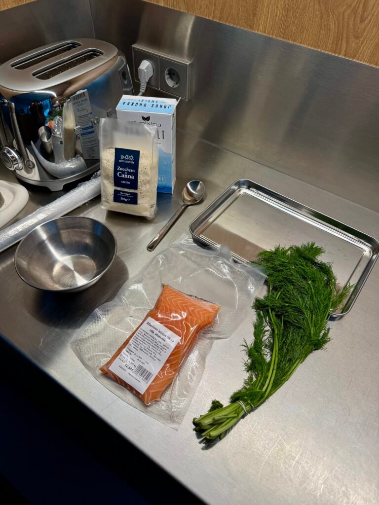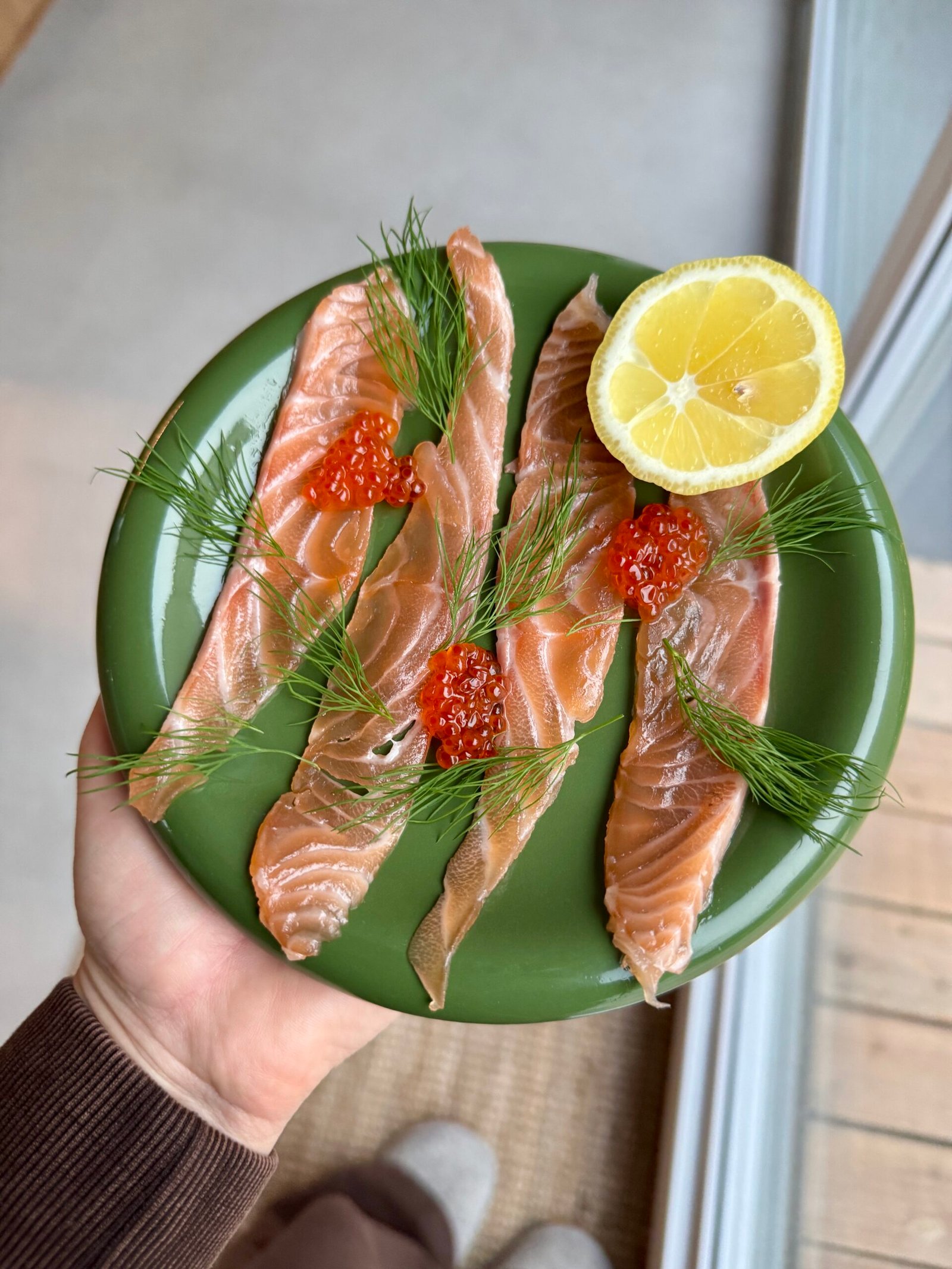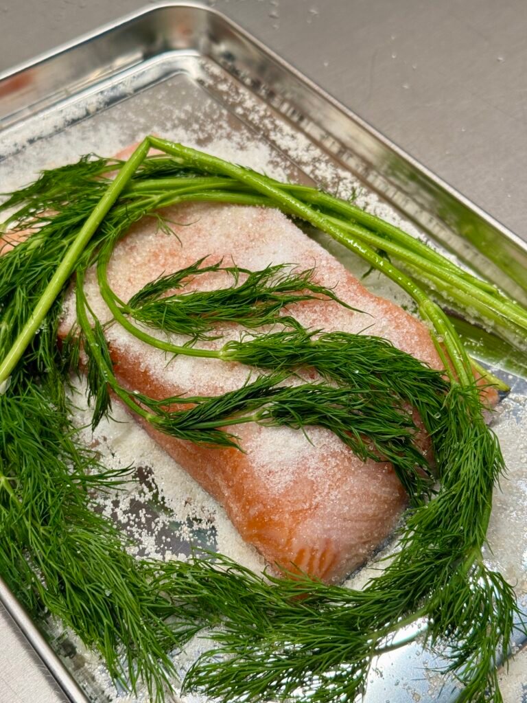 • uždenk maistine plėvele ir laikyk šaldytuve 12 h, jei lašišos gabalėlis didesnis, arba sūdai pvz visą išklotinę – palik šaldytuve 24h.