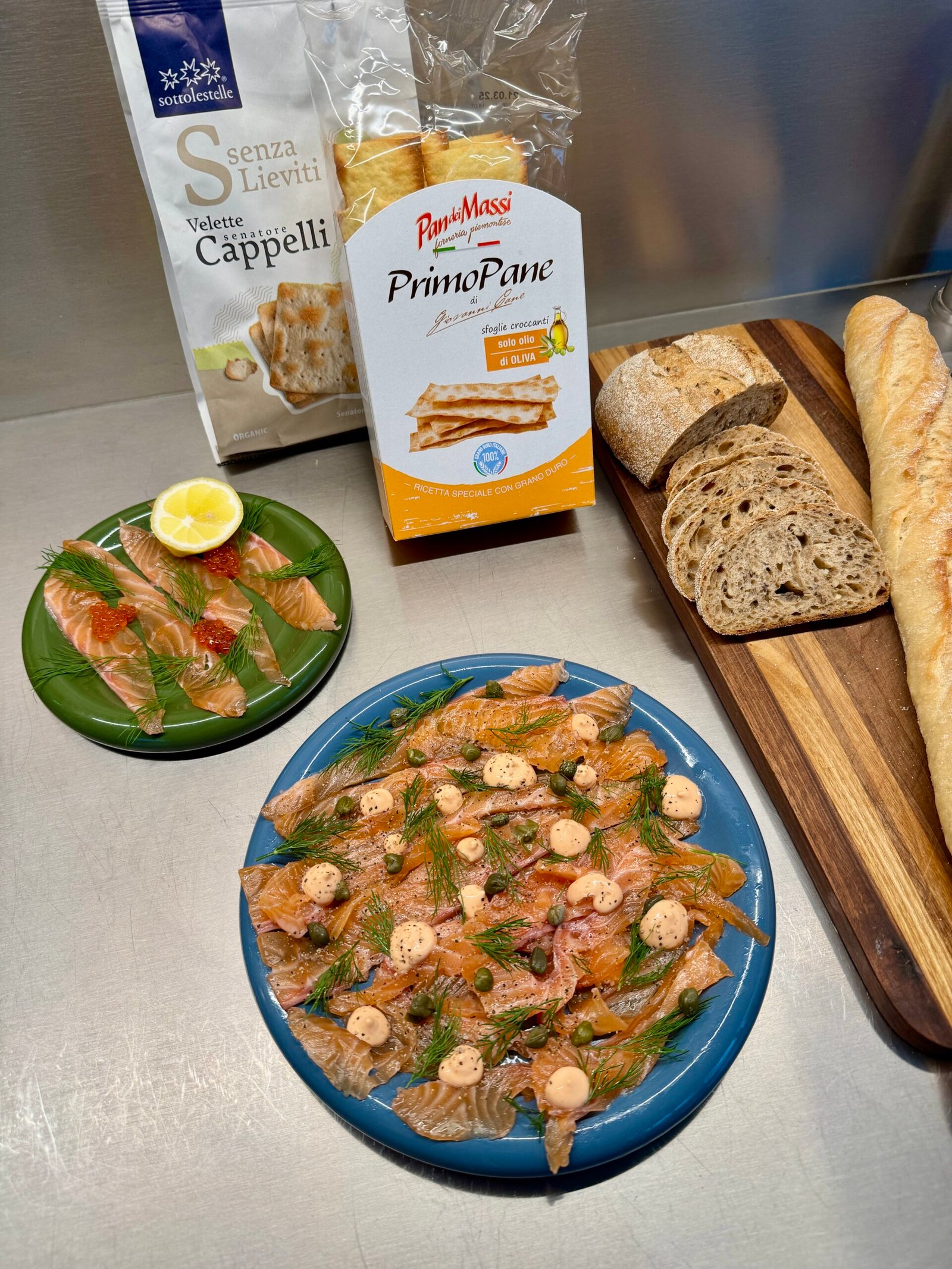 • išėmus iš šaldytuvo lašišą nusklalauk su šaltu vandeniu, nusausink su popieriniu rankšluosčiu ir supjaustyk plonomis juostelėmis