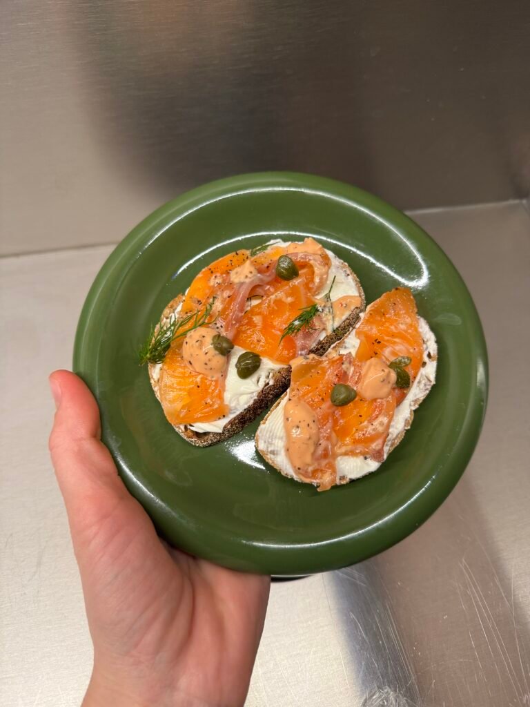 • patiek su mėgstamiausia duonele ar trapučiais, dar keliais šviežiais krapeliais, citrina, ikrais, kaparėliais ar su special padažiuku*